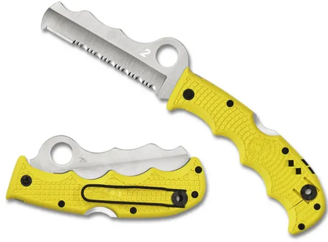 The Assist Salt’s bright yellow handle is injection molded from tough fiberglass-reinforced nylon and has both a Bi-Directional Texture™ pattern and finger grooves to guarantee a secure grip. The finger grooves also provide a solid purchase that enables the blade to “scissor cut” rope much like a cigar cutter. Squeeze the Assist Salt’s closed blade and a retractable carbide glass breaker extends from the butt end of the handle to safely and efficiently break windows. A built-in survival whistle, sturdy back lock mechanism, and a reversible wire pocket clip round out the knife’s features and ensure convenient carry and completely ambidextrous operation.