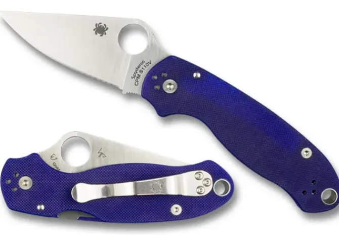 This elite version of the Para 3 supercharges the performance of this compact design with state-of-the-art CPM® S110V® blade steel. In its basic form, the Para 3 distills all the best-in-class features and benefits of the iconic Para Military™ 2 into a smaller, more pocket-friendly format. When enhanced with CPM S110V, its full-flat-ground PlainEdge™ blade achieves even higher levels of wear resistance and corrosion resistance—qualities that optimize its performance as a cutting tool. CPM S110V’s high carbon content, advanced alloy mix, and high volume of vanadium and niobium carbides significantly increase the steel’s edge-holding properties as compared to other particle metallurgy steels. This extreme edge retention complements the Para 3’s many other distinguishing features—exceptional ergonomics, a high-strength Compression Lock® mechanism, and versatile four-position pocket clip—to make it one of the most capable production folding knives available today. To make it even more special, this remarkable expression of the Para 3 proudly wears textured G-10 handle scales in the deep midnight blue color that is a signature of Spyderco’s CPM S110V breed.
