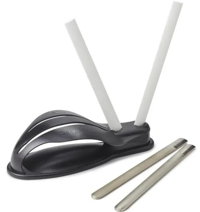 The Gauntlet is a simple, easy-to-use sharpening system that enables even novice users to achieve razor-sharp edges in just a few minutes without electricity, oil, water, or complicated clamps or fixtures. Its injection-molded, high-impact-plastic base has an integral handguard and specially designed holes that hold abrasive rods at the perfect 40-degree angle (20 degrees per side) to create keen, long-wearing edges.