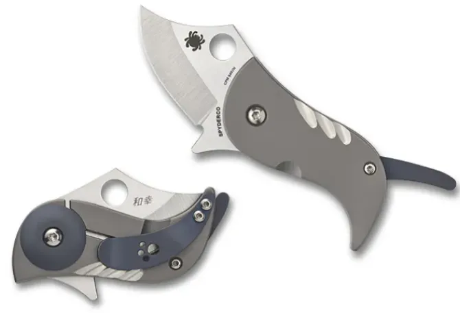 His first Spyderco collaboration faithfully translates this novel design into a unique production folder with a hollow-ground CPM S45VN™ blade, a bead-blasted titanium handle, a Reeve Integral Lock (R.I.L.), and a blue-anodized folding “tail,” titanium pocket clip, and pivot-pin accent.